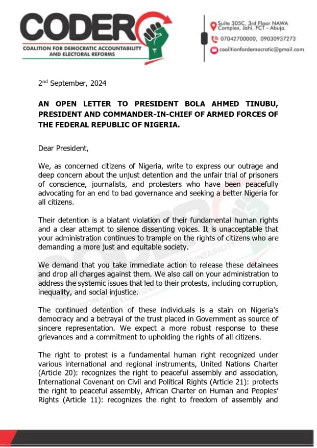 A pro-democracy Civil Society Group (CSO), Coalition for Democratic Accountability and Electoral Reforms (CODER) has written an open letter to the President Of Nigeria (PON), Bola Tinubu, demanding the immediate release of all persons who are being detained and are being prosecuted in various courts, following their arrest for participating or being associated with the #BadGovernance protest that took place across the country between August 1-10.